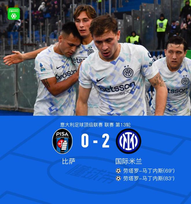 北京时间11月30日意甲联赛第13轮,比萨主场对阵国际米兰。双方上半场比赛局势稍显平淡;下半场,皮奥-埃斯波西托和巴雷拉先后送出助攻,劳塔罗-马丁内斯梅开二度。最终,国际米兰客场2-0完胜比萨。